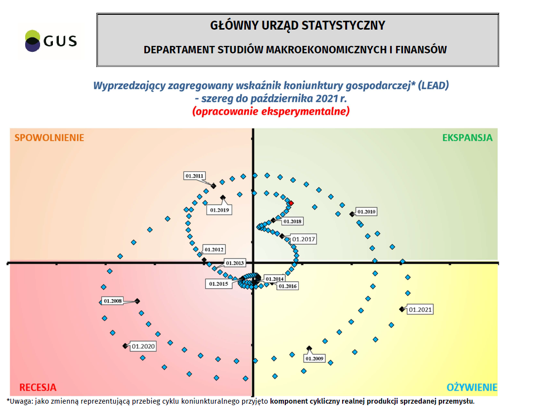 Równoległy oraz wyprzedzający zagregowany wskaźnik koniunktury, zegar koniunktury - szereg do października 2021