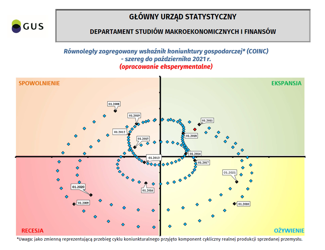 W ramach prac statystyki eksperymentalnej prowadzona jest analiza cykli koniunkturalnych dokonywana na podstawie złożonych (syntetycznych/zagregowanych) wskaźników opisujących w sposób syntetyczny wahania koniunkturalne w całej gospodarce. Oszacowano równoległy (COINC) oraz wyprzedzający (LEAD) zagregowany wskaźnik koniunktury gospodarczej. Wskaźnik równoległy (jednoczesny) odzwierciedla bieżący stan koniunktury, natomiast wyprzedzający wskaźnik koniunktury przedstawia, z pewnym określonym wyprzedzeniem, przyszły stan koniunktury gospodarczej. Zegar cyklu koniunkturalnego (wykres fazowy cyklu koniunkturalnego) jest narzędziem ułatwiającym analizę przebiegu cyklu koniunkturalnego. Przedstawia on w sposób graficzny miejsce różnych zmiennych gospodarczych (zagregowanych bądź też pojedynczych wskaźników) w cyklu koniunkturalnym. Służy on przede wszystkim do ilustracji zjawiska w horyzoncie średnioterminowym. Zegar jest przedstawiany graficznie w formie układu współrzędnych.