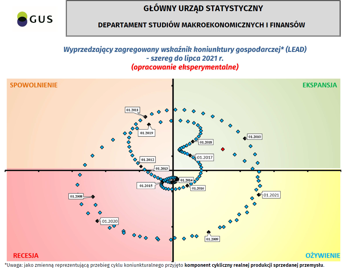 Równoległy oraz wyprzedzający zagregowany wskaźnik koniunktury, zegar koniunktury - szereg do lipca 2021 r.