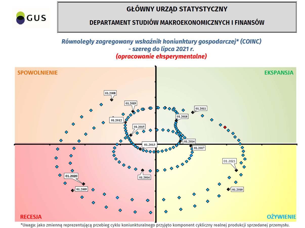 W ramach prac statystyki eksperymentalnej prowadzona jest analiza cykli koniunkturalnych dokonywana na podstawie złożonych (syntetycznych/zagregowanych) wskaźników opisujących w sposób syntetyczny wahania koniunkturalne w całej gospodarce. Oszacowano równoległy (COINC) oraz wyprzedzający (LEAD) zagregowany wskaźnik koniunktury gospodarczej. Wskaźnik równoległy (jednoczesny) odzwierciedla bieżący stan koniunktury, natomiast wyprzedzający wskaźnik koniunktury przedstawia, z pewnym określonym wyprzedzeniem, przyszły stan koniunktury gospodarczej. Zegar cyklu koniunkturalnego (wykres fazowy cyklu koniunkturalnego) jest narzędziem ułatwiającym analizę przebiegu cyklu koniunkturalnego. Przedstawia on w sposób graficzny miejsce różnych zmiennych gospodarczych (zagregowanych bądź też pojedynczych wskaźników) w cyklu koniunkturalnym. Służy on przede wszystkim do ilustracji zjawiska w horyzoncie średnioterminowym. Zegar jest przedstawiany graficznie w formie układu współrzędnych.