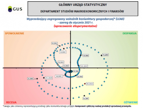 Równoległy oraz wyprzedzający zagregowany wskaźnik koniunktury, zegar koniunktury - szereg do stycznia 2021 r.