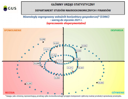 W ramach prac statystyki eksperymentalnej prowadzona jest analiza cykli koniunkturalnych dokonywana na podstawie złożonych (syntetycznych/zagregowanych) wskaźników opisujących w sposób syntetyczny wahania koniunkturalne w całej gospodarce. Oszacowano równoległy (COINC) oraz wyprzedzający (LEAD) zagregowany wskaźnik koniunktury gospodarczej. Wskaźnik równoległy (jednoczesny) odzwierciedla bieżący stan koniunktury, natomiast wyprzedzający wskaźnik koniunktury przedstawia, z pewnym określonym wyprzedzeniem, przyszły stan koniunktury gospodarczej. Zegar cyklu koniunkturalnego (wykres fazowy cyklu koniunkturalnego) jest narzędziem ułatwiającym analizę przebiegu cyklu koniunkturalnego. Przedstawia on w sposób graficzny miejsce różnych zmiennych gospodarczych (zagregowanych bądź też pojedynczych wskaźników) w cyklu koniunkturalnym. Służy on przede wszystkim do ilustracji zjawiska w horyzoncie średnioterminowym. Zegar jest przedstawiany graficznie w formie układu współrzędnych.