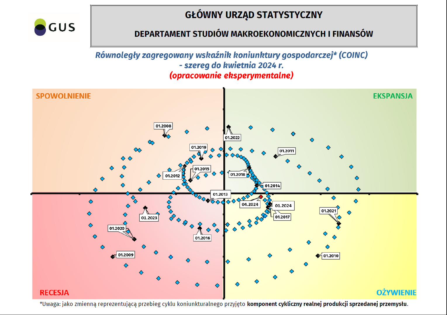- Równoległy oraz wyprzedzający zagregowany wskaźnik koniunktury, zegar koniunktury - szereg do stycznia 2024 r.